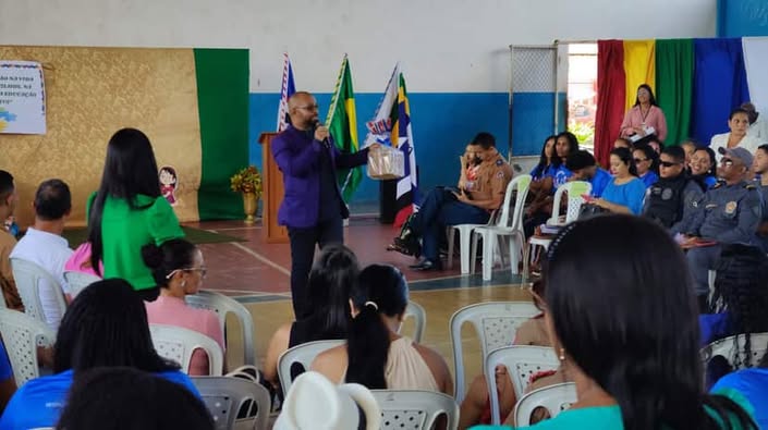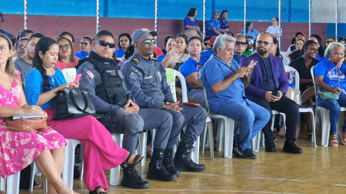 Diversas autoridades participaram do evento, entre elas a secretária de Educação, Ligiane Cantanhede, o vice-prefeito Olavo Cardoso, secretários municipais, vereadores, Polícia Militar, professores, gestores escolares, além de membros do Ministério Público e demais colaboradores da educação e da administração municipal.