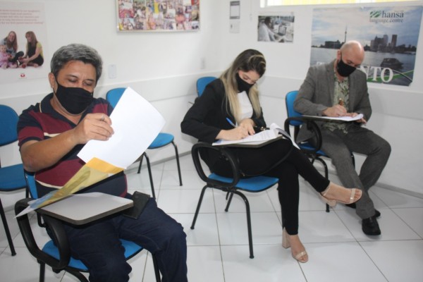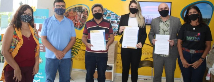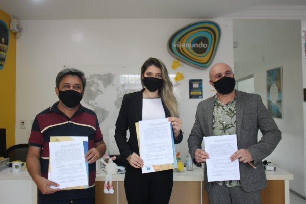 Legenda: Prefeito de Guimarães, Orlando Gomes, a assessora especial da Secretaria de Estado de Educação, Thaina da Cunha Pachêco, e o diretor da Via Mundo, Antonio Bacelar, na assinatura do convênio.