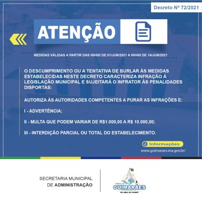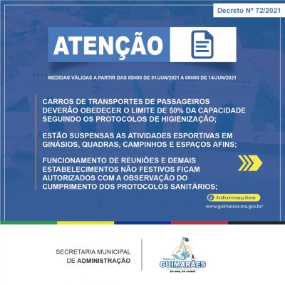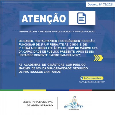 Devido os indicadores crescentes do número de casos da Covid 19 em todo o país, inclusive com infecção comprovada da variante indiana, o prefeito Osvaldo Gomes divulgou o decreto n? 72/2021, em ficam suspensos do dia 1? ao dia 14 de junho de 2021, eventos esportivos de qualquer natureza, bem como eventos festivos em clubes, bares e afins.