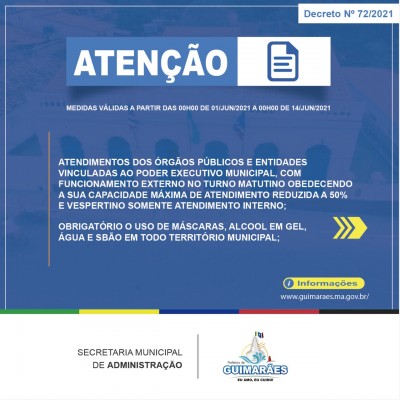 A Prefeitura e os demais órgãos e entidades vinculados, continuam com funcionamento presencial externo no turno matutino e interno no turno vespertino, com 50% da capacidade.