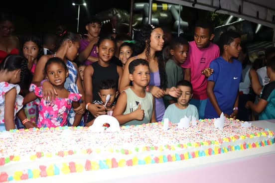 Além dos brinquedos e apresentações, o evento contou com entrega de presentes e brindes, distribuição gratuita de sorvete e pipoca, e ainda um bolo gigante de 10 metros, que foi um dos pontos altos da tarde. Tudo pensado com carinho para proporcionar momentos de alegria às crianças e suas famílias.